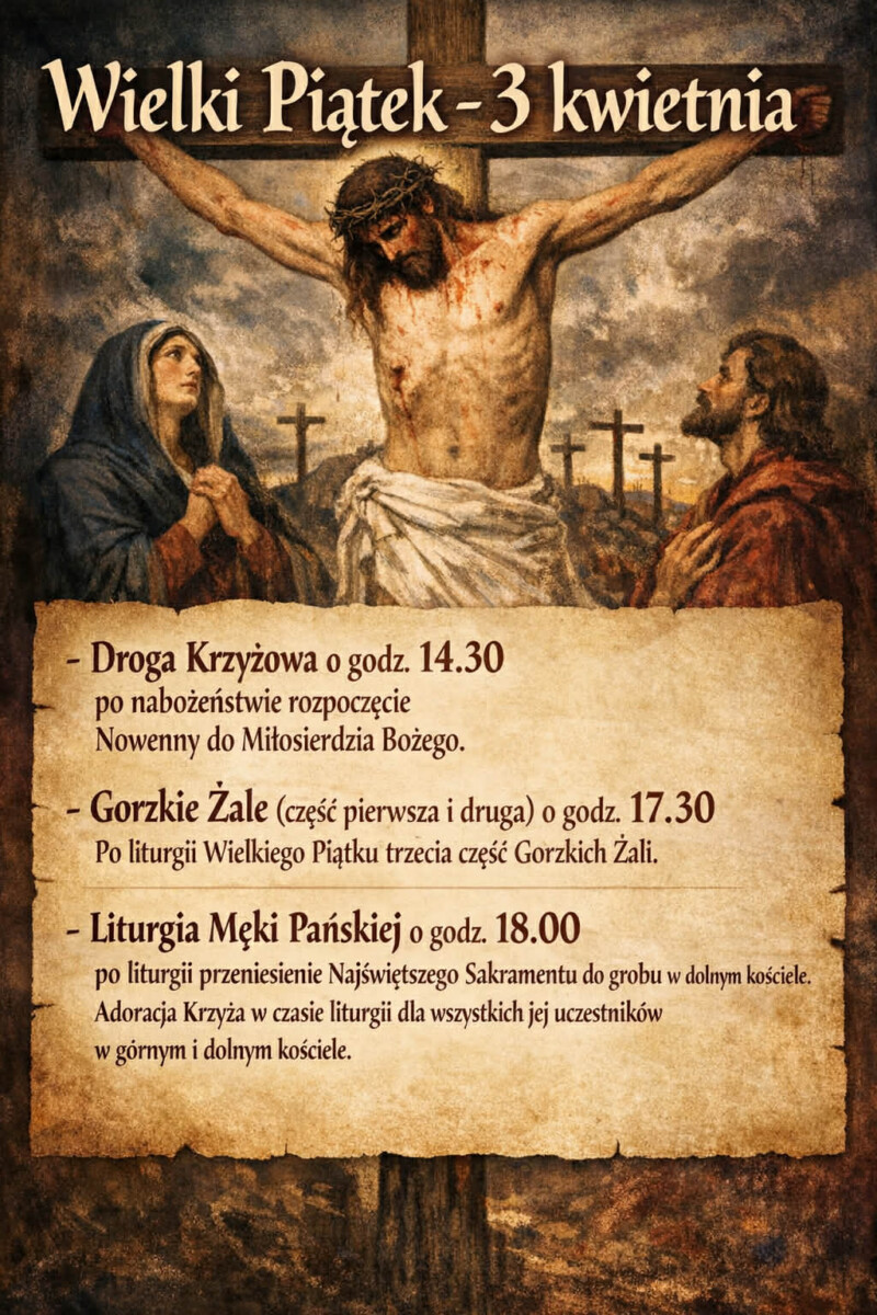 – Gorzkie Żale (część pierwsza i druga) o godz. 17.30. Po liturgii Wielkiego Piątku trzecia część Gorzkich Żali.